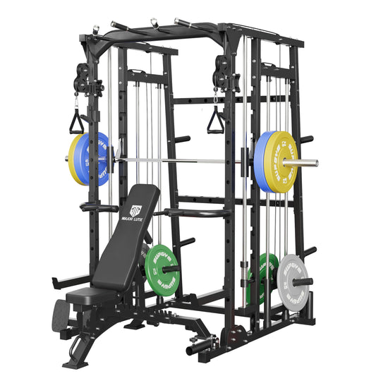 MAJOR LUTIE Fitness Smith Machine with Weight Bench and 230LBS Olympic Plates, SML07 All-In-One Home Gym Black Power Cage with Smith Bar and Two LAT Pull-Down Systems and Cable Crossover Machine Black