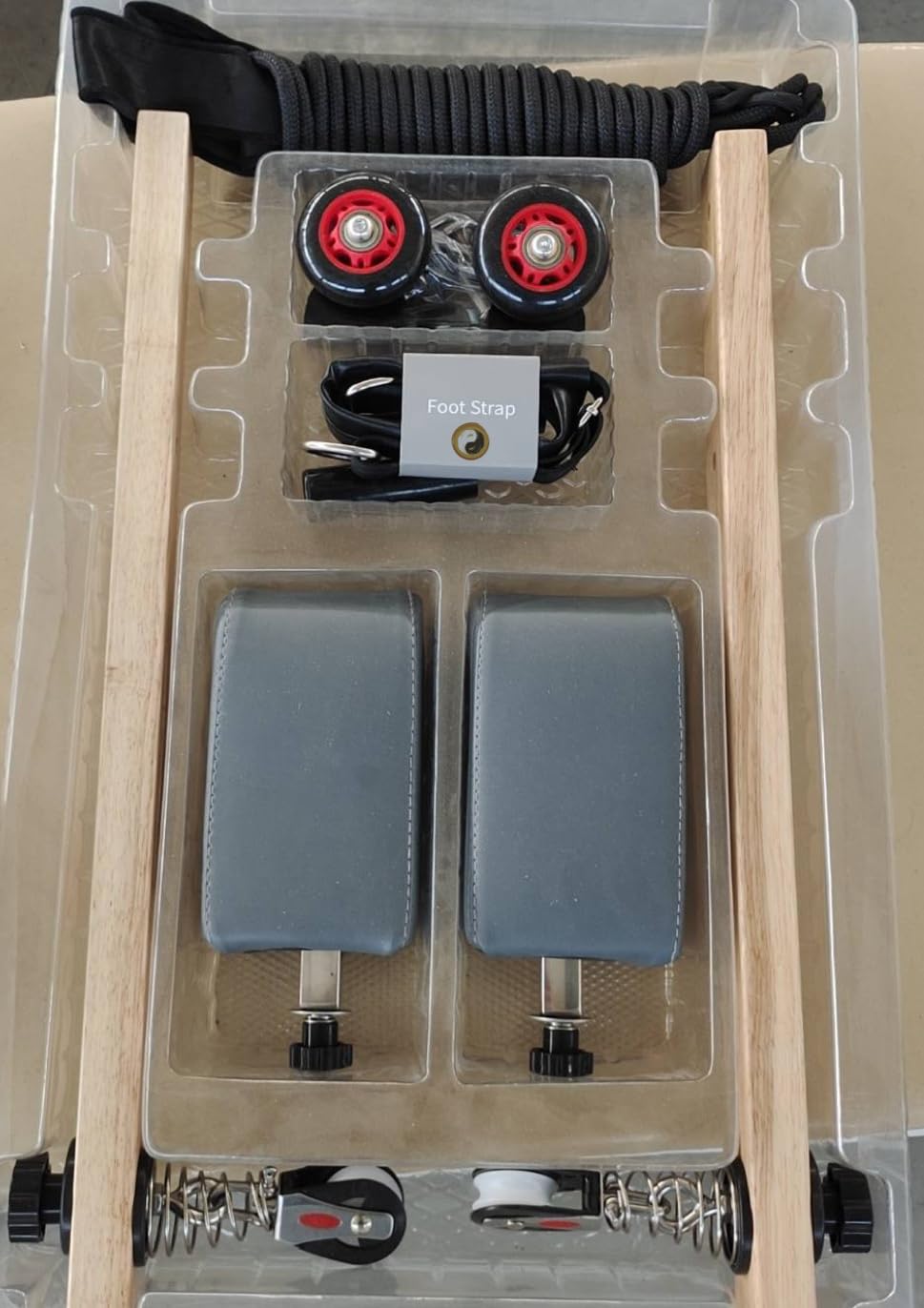 • Pilates Springs: The springs are different colors and each color has a different resistance, there are 16 springs in total, 6 in the bracket, 8 in the tower and 2 in the cage.